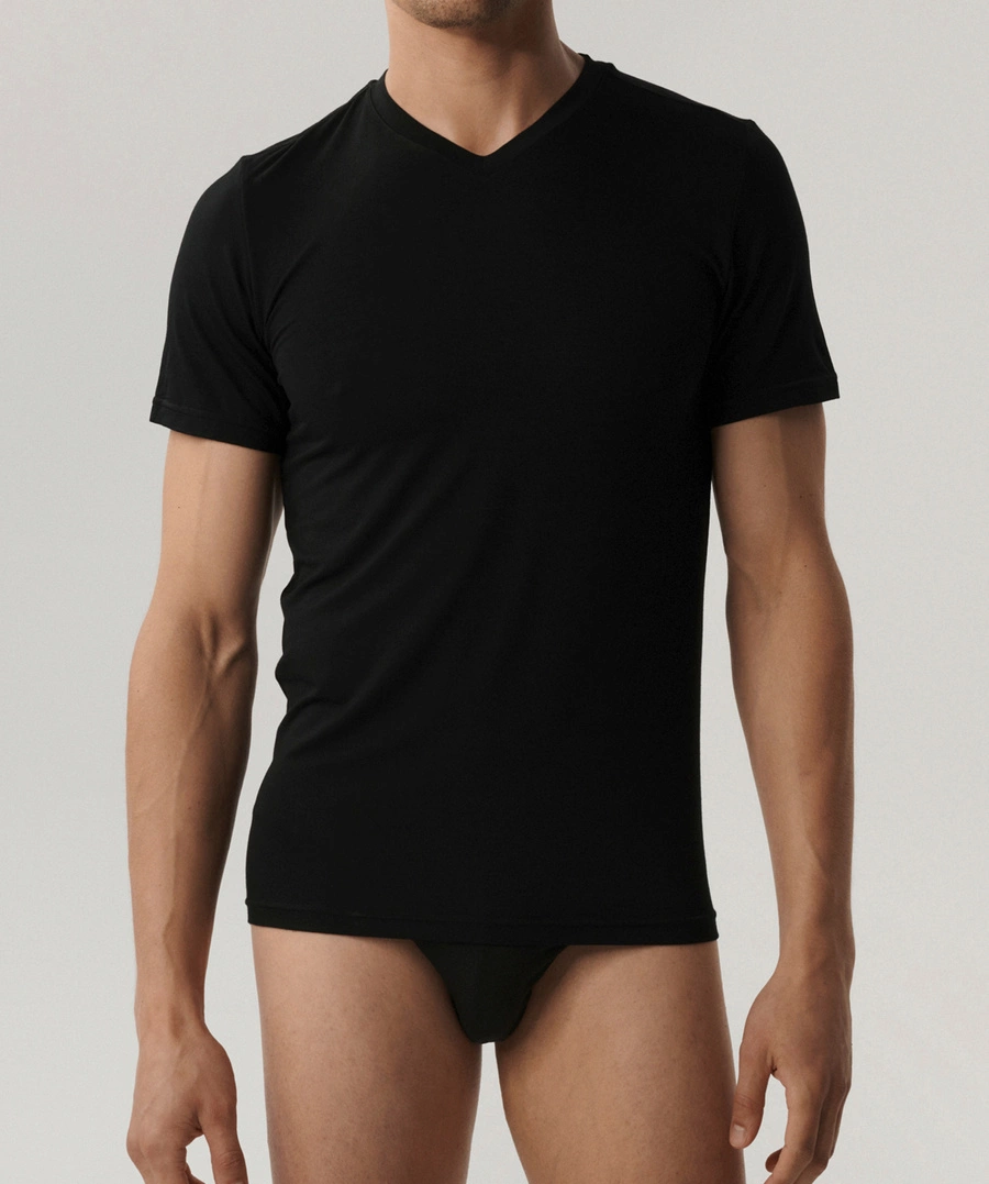 - Aspect elegant: Culoarea neagră și decolteul în V conferă tricoului un aspect elegant, dar casual.