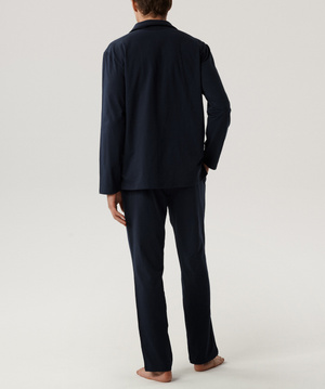 Partea superioară a pijamalei impresionează prin caracterul său asemănător cămășii, cu mâneci lungi și decolteu în formă de V, adăugând o notă de clasă și eleganță. Partea inferioară este un pantalon lung cu picioare drepte, care se potrivește perfect siluetei. Întreaga piesă este realizată din ** bumbac fin și plăcut la atingere**, cu adaos de elastan, care garantează nu numai o potrivire perfectă, ci și durabilitatea țesăturii.