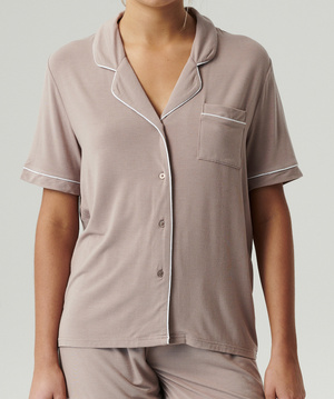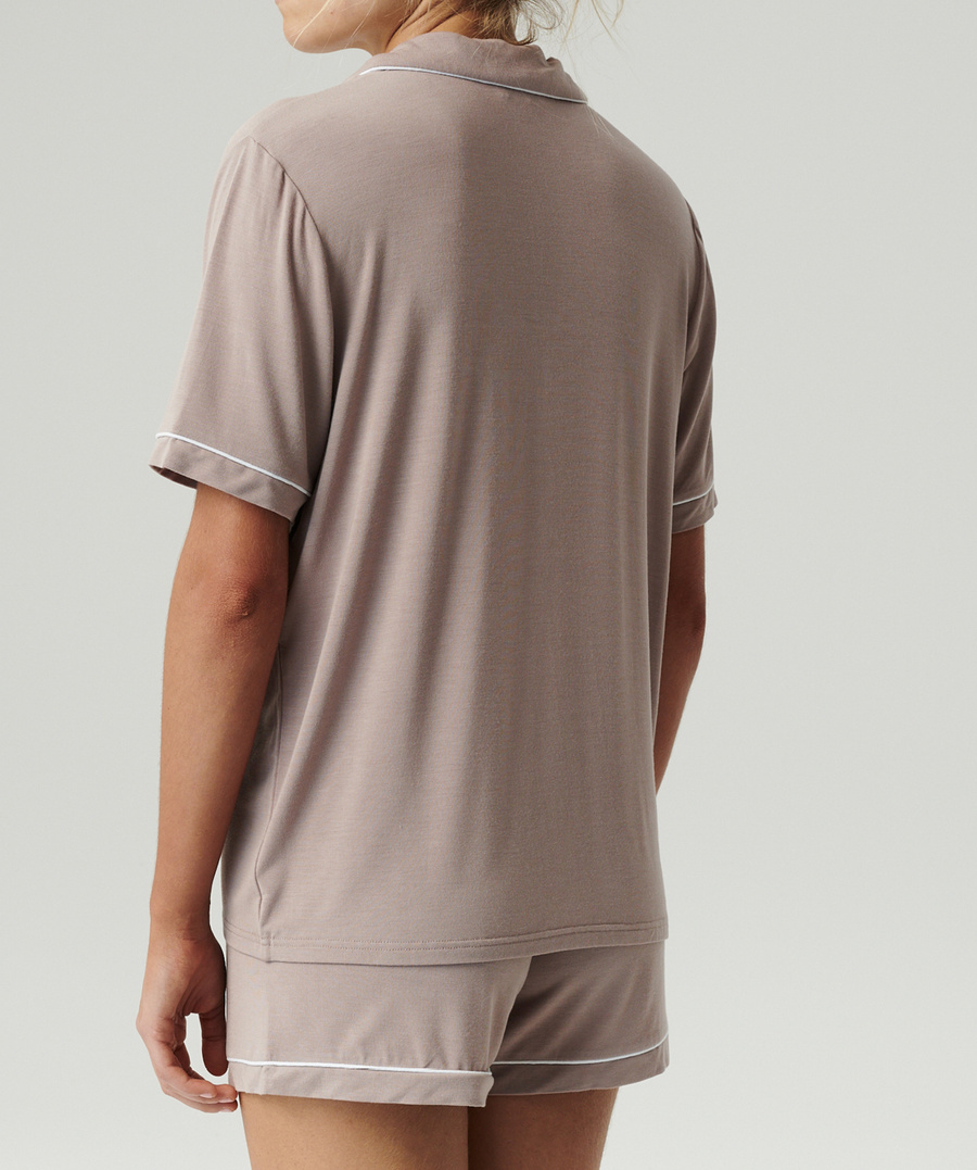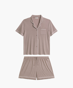 Setul include o bluză tip cămașă cu mâneci scurte și decolteu în V, cu nasturi, și pantaloni scurți cu buzunare laterale practice. Cu croiala la modă și materialul ultraușor, pijamaua oferă 100% confort și libertate de mișcare, fiind alegerea perfectă pentru nopțile calde de vară.