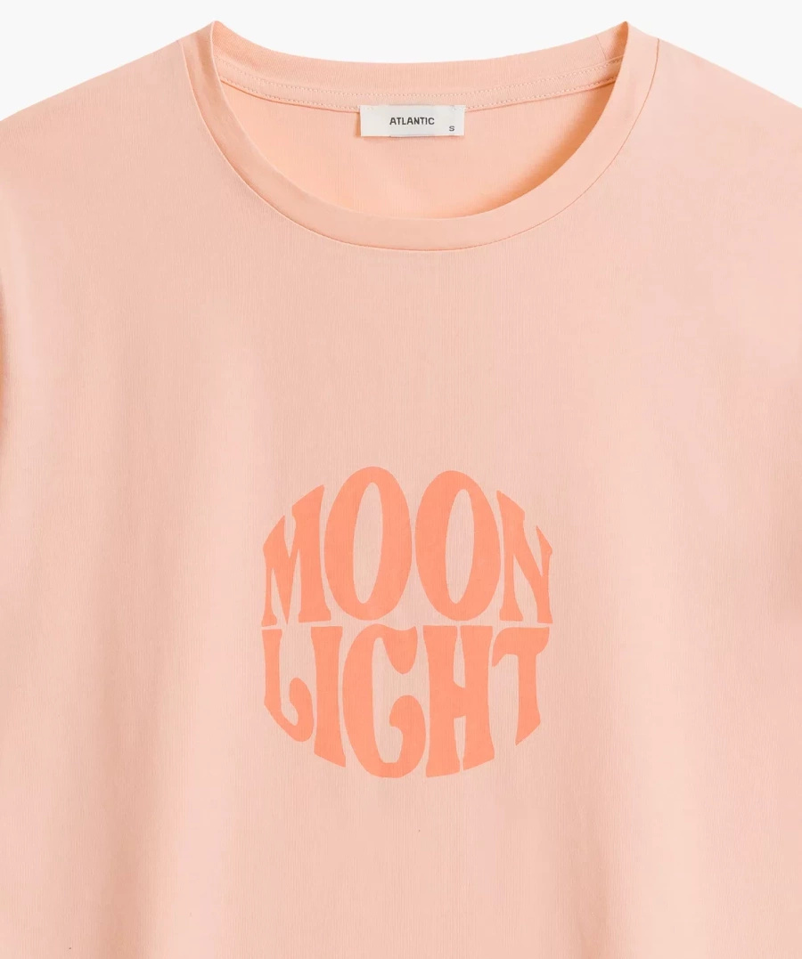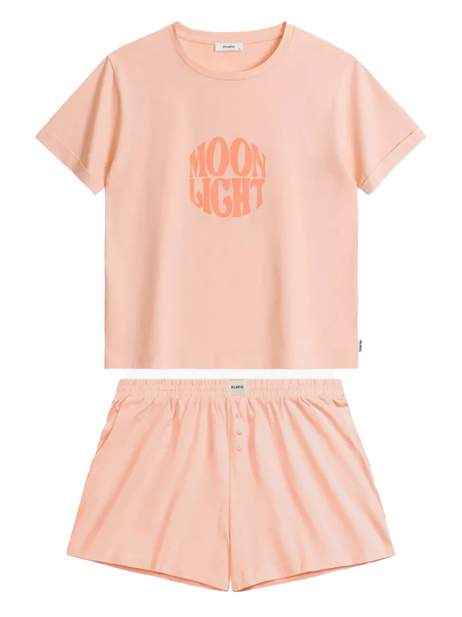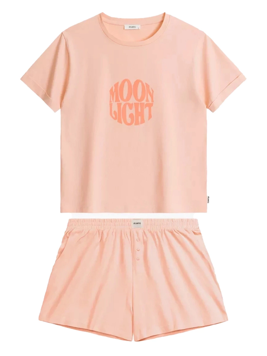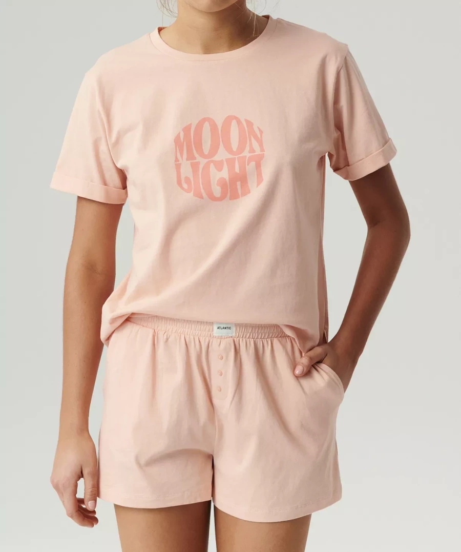 Confortul și eleganța merg mână în mână datorită bumbacului moale din care este confecționată pijamaua. Acest material nu numai că oferă o senzație plăcută pe piele, dar și evacuează perfect umezeala, lăsându-vă uscat toată noaptea. Tricoul cu mâneci scurte, răsucite și decolteu rotund, decorat cu o inscripție mare "Moonlight", subliniază un stil modern, care cu siguranță îi va atrage chiar și pe cei mai pretențioși.