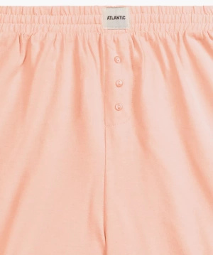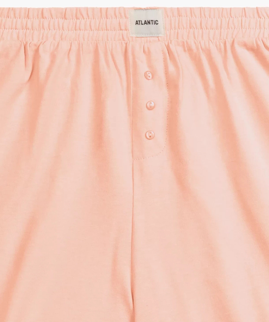 Pantalonii scurți cu buzunare laterale nu sunt doar o soluție practică, ci garantează și o libertate completă de mișcare. Talia elastică fără presare, decorată cu un logo subtil Atlantic, asigură o potrivire perfectă pentru orice siluetă, făcând din această pijama cadoul perfect pentru o persoană dragă.