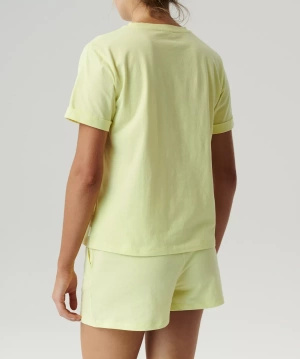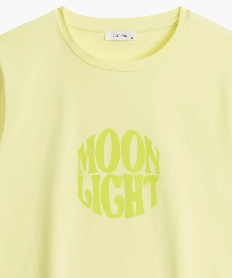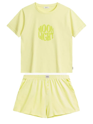 Confortul și eleganța merg mână în mână datorită bumbacului moale din care este confecționată pijamaua. Acest material nu numai că oferă o senzație plăcută pe piele, dar și evacuează perfect umezeala, lăsându-vă uscat toată noaptea. Tricoul cu mâneci scurte, răsucite și decolteu rotund, decorat cu o inscripție mare "Moonlight", subliniază un stil modern, care cu siguranță îi va atrage chiar și pe cei mai pretențioși.
