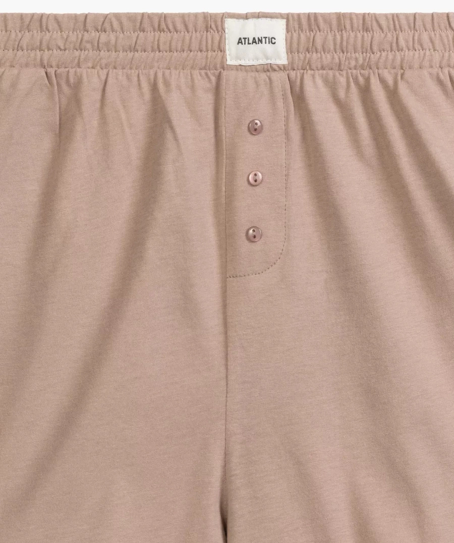 Pantalonii scurți cu buzunare laterale nu sunt doar o soluție practică, ci garantează și o libertate completă de mișcare. Talia elastică fără presare, decorată cu un logo subtil Atlantic, asigură o potrivire perfectă pentru orice siluetă, făcând din această pijama cadoul perfect pentru o persoană dragă.