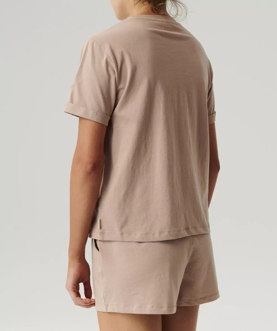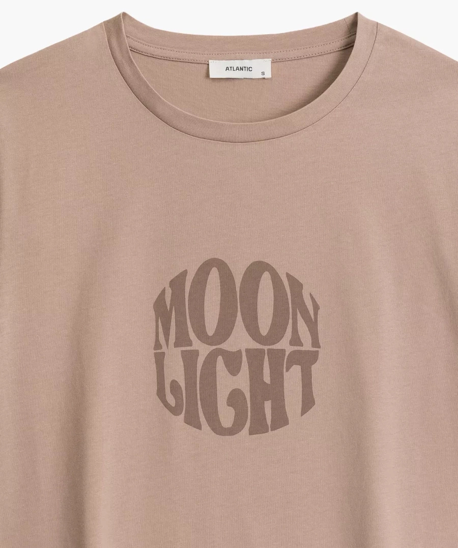 Confortul și eleganța merg mână în mână datorită bumbacului moale din care este confecționată pijamaua. Acest material nu numai că oferă o senzație plăcută pe piele, dar și evacuează perfect umezeala, lăsându-vă uscat toată noaptea. Tricoul cu mâneci scurte, răsucite și decolteu rotund, decorat cu o inscripție mare "Moonlight", subliniază un stil modern, care cu siguranță îi va atrage chiar și pe cei mai pretențioși.