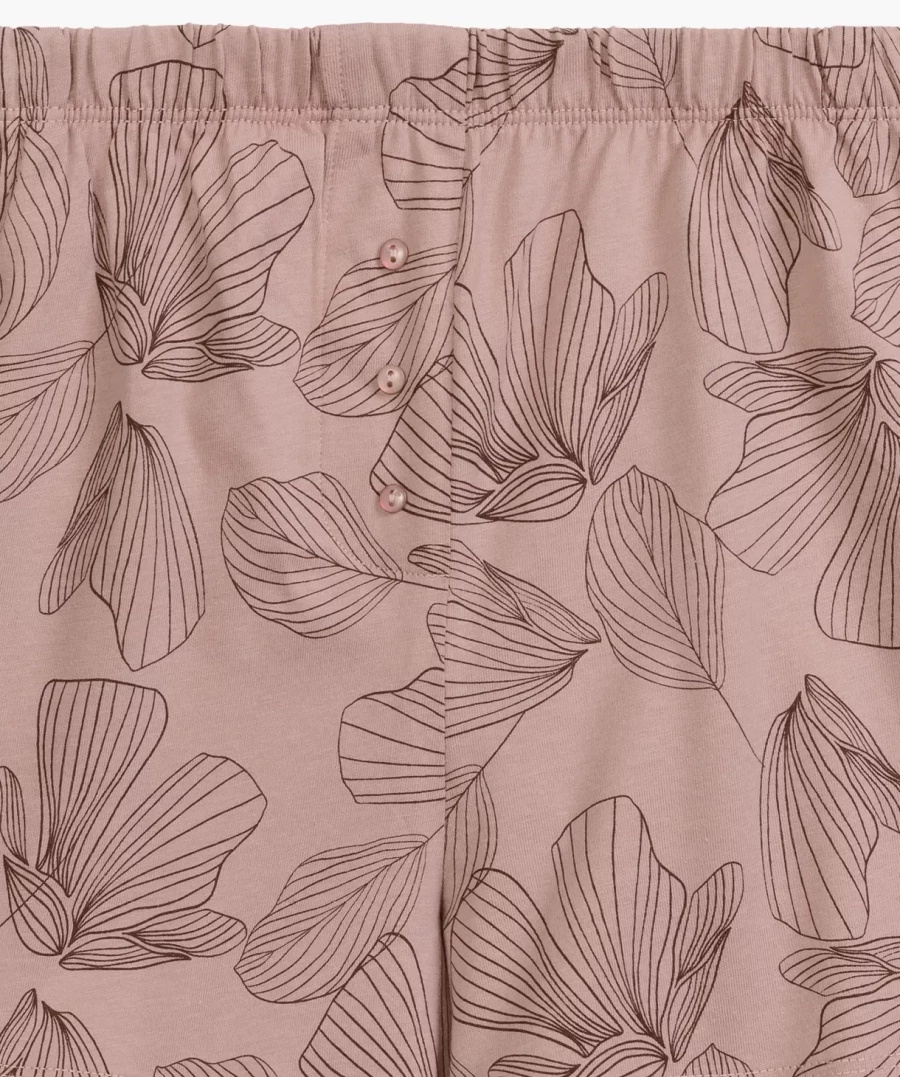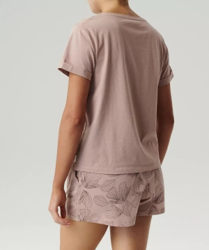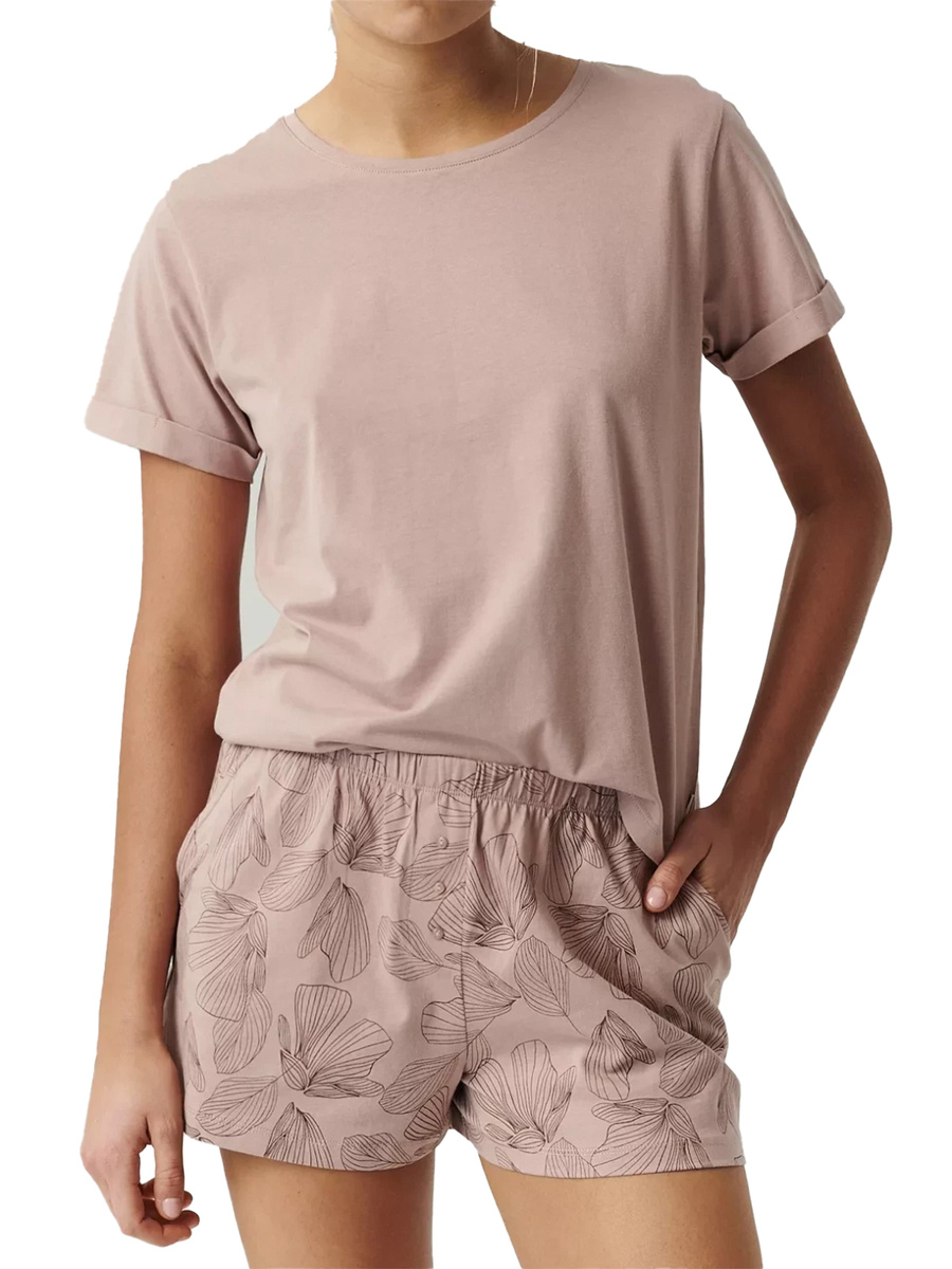 Pijamaua pentru femei constă dintr-un tricou simplu și pantaloni scurți care combină stilul modern cu caracterul practic. Tricoul are mâneci scurte, rulate și un decolteu rotund, care adaugă o notă ușoară și elegantă. Pantalonii scurți cu buzunare laterale, finisați cu o talie elastică largă și confortabilă, asigură potrivirea perfectă și libertatea de purtare.