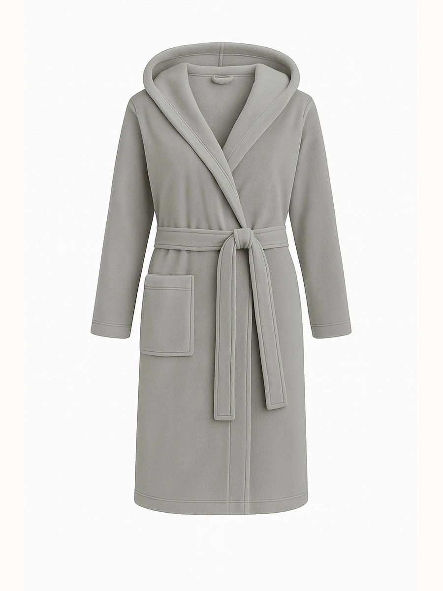Halatul de baie se distinge prin designul său elegant, care combină stilul modern cu soluții practice. Mânecile lungi și lungimea până la genunchi asigură o potrivire confortabilă, în timp ce gluga vă protejează de frig, adăugând la aspectul elegant al halatului. Două buzunare practice și o cravată la talie sunt caracteristici suplimentare care se adaugă funcționalității acestui produs.
