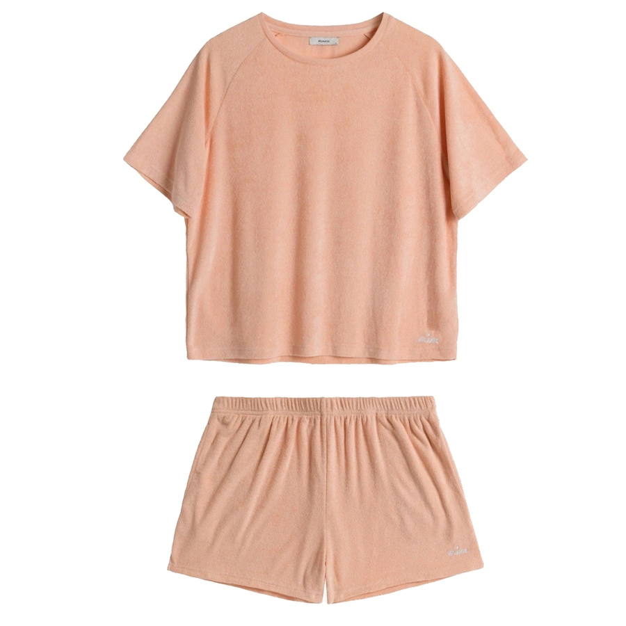 Descoperiți setul nostru de femei din terry într-o nuanță subtilă de piersică de la Atlantic, care combină perfect stilul și confortul. Setul este format dintr-un tricou lejer și pantaloni scurți confortabili, creând îmbrăcămintea perfectă de purtat prin casă, precum și pijamaua funcțională.