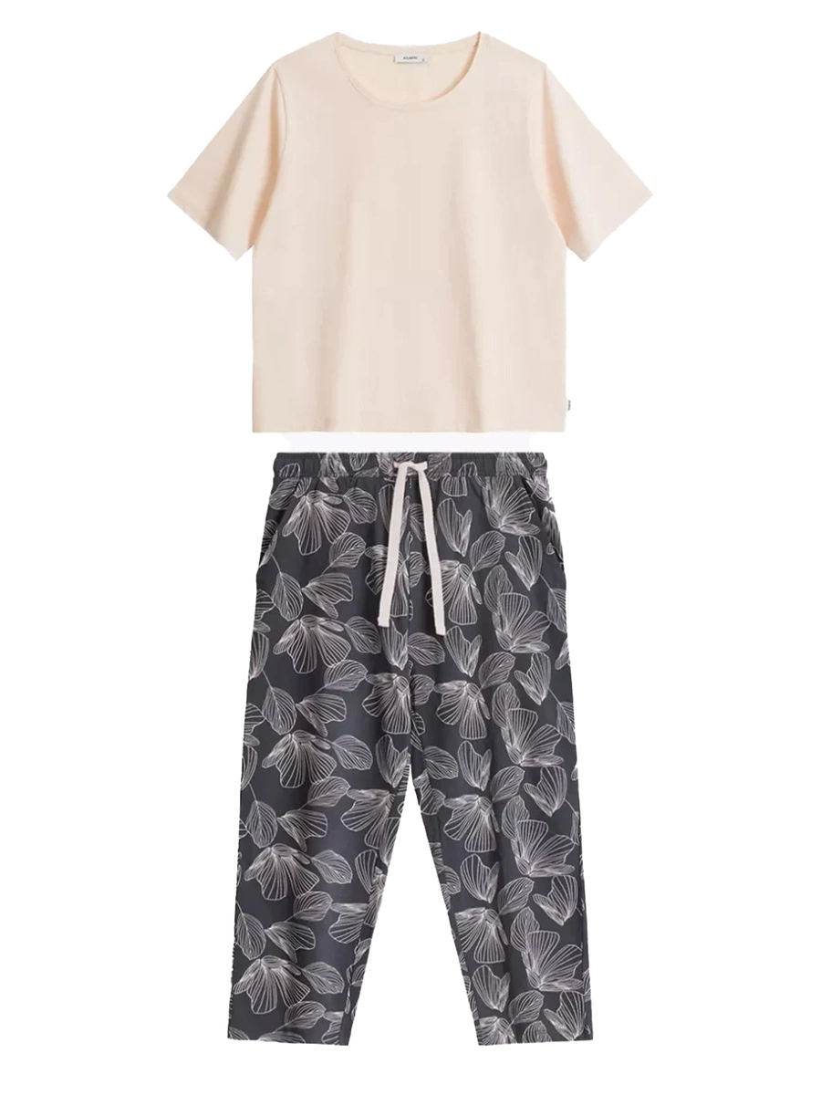 Designul unic combină un tricou simplu într-o nuanță de pudră deschisă cu pantaloni grafiti cu lungime 3/4, decorați cu un imprimeu floral subtil. Tricoul cu mâneci scurte și decolteu rotund se potrivește perfect siluetei, în timp ce pantalonii cu buzunare practice și o fundă în talie asigură libertatea de mișcare.