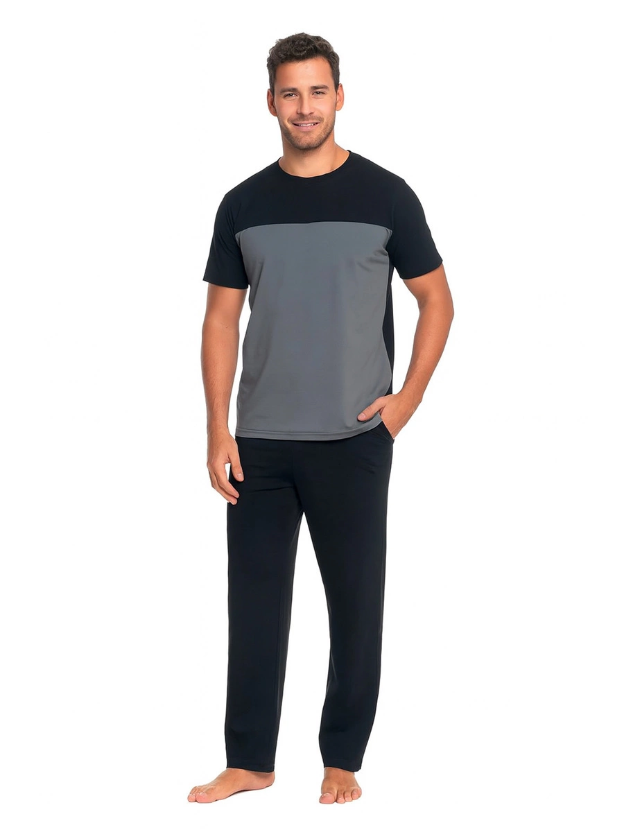 Tricoul cu mânecă scurtă în nuanțe surde de negru și gri impresionează printr-un design simplu, dar modern, care se potrivește ușor cu orice gust. Materialul prietenos cu pielea face din pijama alegerea perfectă pentru toate anotimpurile, având grijă de bunăstarea ta indiferent de temperatură. Pantalonii lungi în negru clasic au fost prevăzuți cu o talie elastică, garantând o potrivire perfectă și libertate deplină de mișcare.